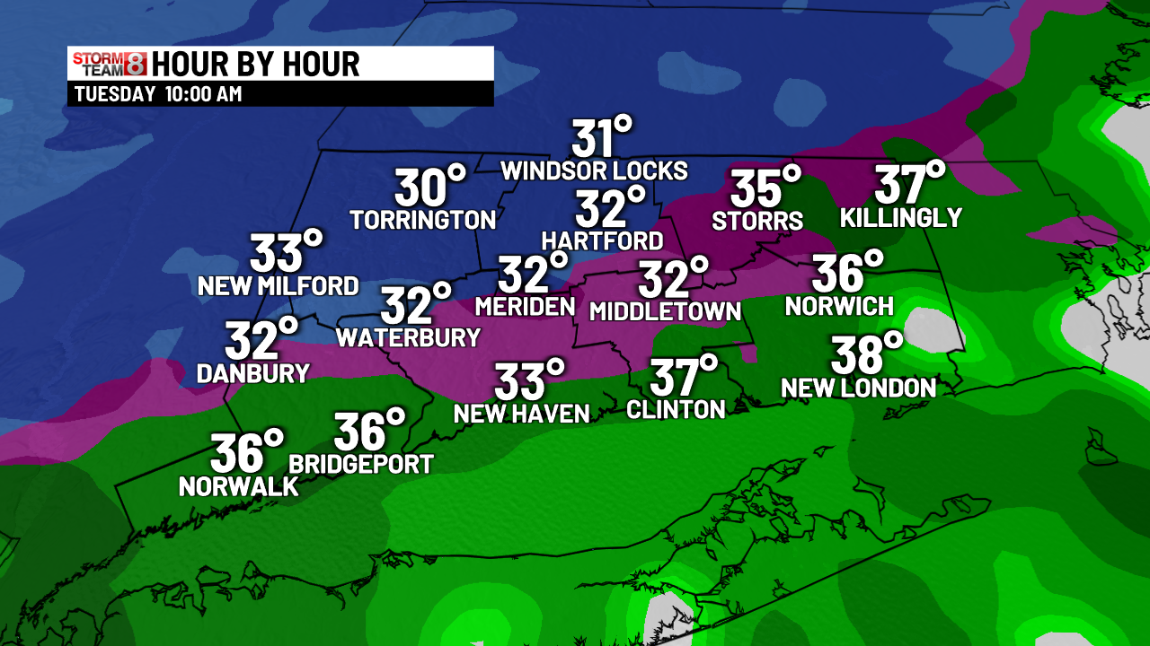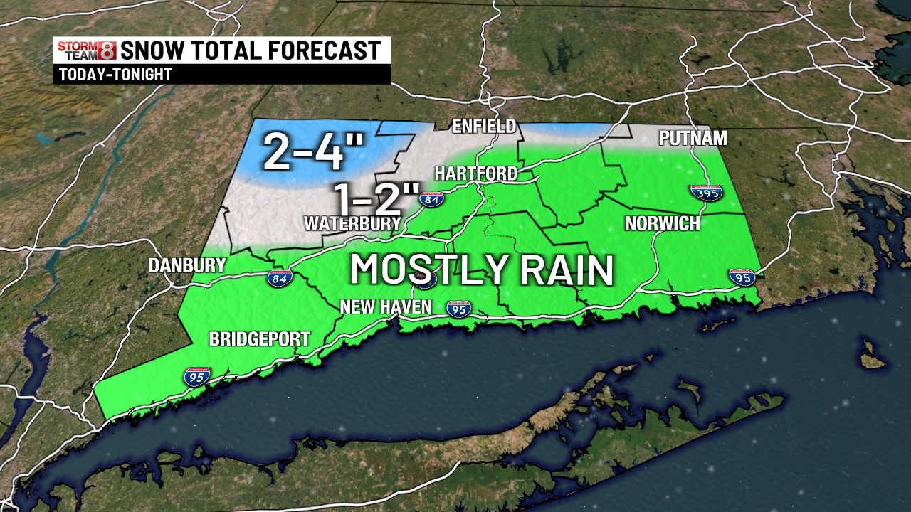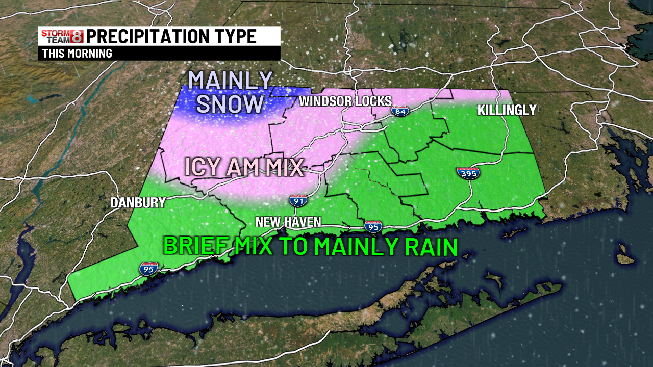 Today: Any mix quickly changing to rain for southern Connecticut. Icy mix inland for a while with slick surfaces possible, then changing to rain around noon. Mostly snow/ice in NW CT with 2″ to 4″ there. Timing looks to be mostly 9 AM-9 PM.