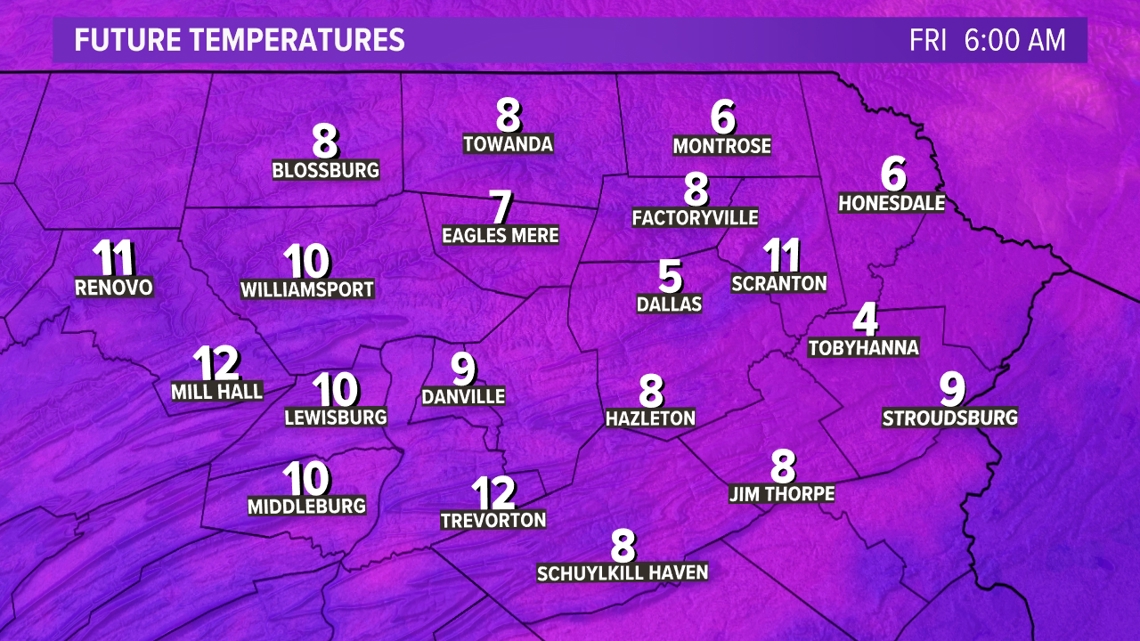 The Scranton area near 10 degrees and Williamsport will both be near 10 degrees. Elevated areas in the Poconos may experience lows only a few degrees above 0.